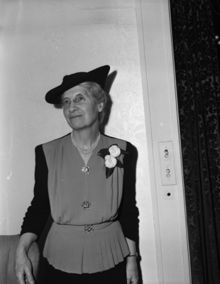 Mrs. Mabel Bacon Happer of San Francisco, California, is an authority on Oriential arts and gardens. She spoke on "Chinese Gardens" before the Fort Worth Garden Club. Mrs. Happer is wearing hat, blouse, skirt, pearls, and a corsage.