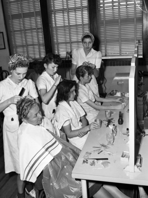 Busy preparations for the annual open house with hair-styling revue. Here are three of the 10 senior girls who will compete in the hair-styling contest, left to right, Misses June Hornsby, Maybelle Painter and Dorothy Gentry. The models are Mrs. Pearl Campbell, Miss Vivian Wright and Miss Juanita Smith. The three models are sitting in chairs in front of a desk with hair pins and styling products on it while the senior girls work on styling their hair. Published in the Fort Worth Star-Telegram morning edition, January 16 1942.