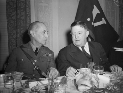 The Chamber of Commerce is holding their Friday night banquet. The event attracted about 600 attendees, including Army officers from all over Texas. In attendance left to right are Lieutenant Colonel Royden Williamson, and County Judge Dave Miller. Colonel Williamson is representing the Eighth Corps Area in Fort Sam Houston. He is dressed in his military uniform. Judge Miller is a county judge in Tarrant County. He is wearing a double breasted, three-piece suit. The men are sitting at a table, eating dinner. There is a flag behind Judge Miller.