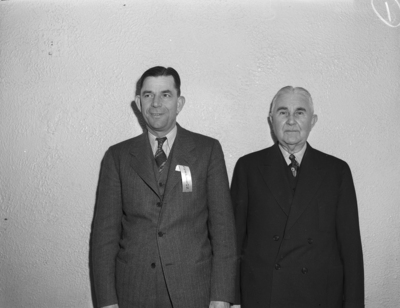 The Chamber of Commerce elected eight new directors with a record mail vote of 733 members. The new directors were installed at a banquet Friday night, for three-year terms. Left to right are J. B. Patterson and W. C. Stonestreet. The men are standing in a line, against a wall. Mr. Patterson is dressed in a three piece suit with a ribbon pinned to the lapel. Mr. Stonestreet is wearing a double breasted, three-piece suit.