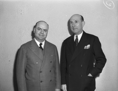 The Chamber of Commerce elected eight new directors with a record mail vote of 733 members. The new directors were installed at a banquet Friday night, for three-year terms. Standing against a wall, left to right are Frank Kent and Jack Farrell. Mr. Kent is wearing a double breasted, three-piece suit. Mr. Farrell is dressed in a dark, double breasted suit with a handkerchief in the pocket.