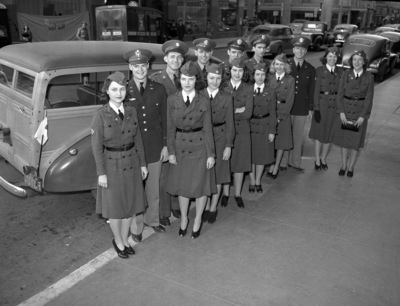Reception for "enemy" fliers from Brooks field during a black-out drill. The girls from the Red Cross Motor Corps are, left to right, Misses Eleanor Sansom, Mary Fry Reynolds, Virginia Farrell, Sue Harding, Suzanne Clery, Nancy Quarles, Betty Beall and Camilla Beall. The fliers are, left to right, Second Lieutenant R. E. Will, Lieutenant W. C. Stroud, Second Lieutenant Bruce Baumgardner, Secend Lieutenant Thruman Bercaw, Second Lieutenant Ray Bergengren, Second Lieutenant Dale Seeds.