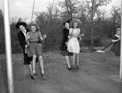 Castleberry school district parent-teacher association secretary Mrs. G. T. Crowley (left) shown pushing Betty Bryant, while Louise Lynn is being given a push by Mrs. O. O. Strother of the association.