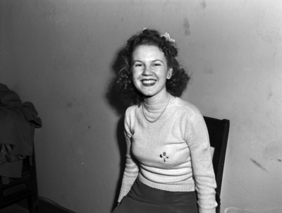 Miss Frankie Jo Lewis, shown here sitting in a chair and smiling at the camera. She recently moved to Fort Worth from San Antonio. She is a new member of the W.A.W. Club and was awarded its "best pledge" pin at a luncheon. She is wearing a sweater, a necklace, and a bow in her hair. Published in the Fort Worth Star-Telegram morning edition, January 21, 1942.