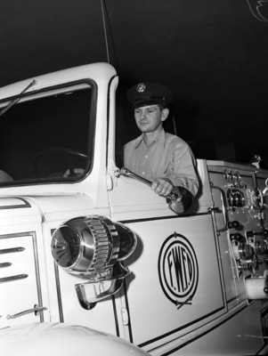 One of the 21 fire trucks which sounded warning sirens for the blackout is shown here. This one is at Central Fire Station with H. K. Pitts, sitting in a truck at the fire station. He is wearing a uniforms and hat. The truck has a Fort Worth Fire Department logo on the driver's side door. Published in the Fort Worth Star-Telegram evening edition, January 20 1942.