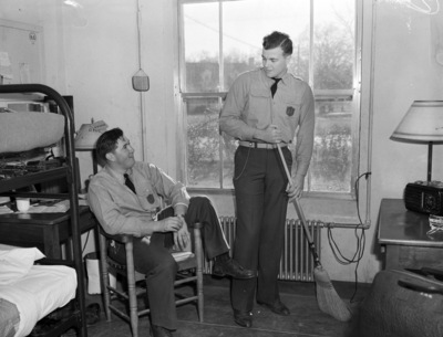 Cadets at the Agricultural and Mechanical College of Texas (A. & M.) after the war-time ban on personal service by freshmen to upperclassmen. O. S. Wyatt Junior, freshman, of Navasota, Texas, watches as Fred Buckland, sophomore, of Harlingen, Texas, sweeps his own room. The students are dressed in their cadet uniforms. Wyatt is sitting in a chair.