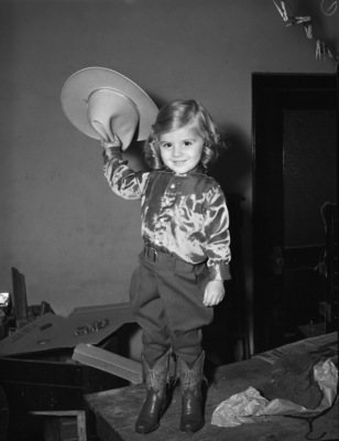 Southwestern Exposition and Fat Stock Show attendee Lannie Jo Plescia, daughter of Mr. and Mrs. Sam Plescia, is wearing a cowgirl outfit standing on a table, holding a cowgirl hat in her right hand.