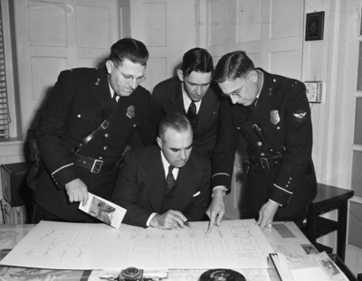 Southwestern Exposition and Fat Stock Show. Advance Publicity. Parade committee: Standing left to right, Police Lieutenant A. J. Reams; Al Purvis, Police Lieutenant C. T. Stamp and Ed P. Maddox.