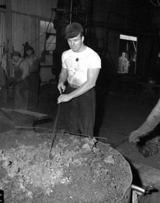 Amateur boxers from all around the area are preparing for the 1942 Golden Gloves District Tournament in Fort Worth, Texas. One of the top contenders in the heavyweight division is Jack Russell. His training regimen not only includes the punching bag at the gym, but also his day job at the munitions plant. He was an all-conference end at Baylor University and has been working out with other members of the Texas Steel Company team. Russell is shown poking a rod into a pot of coals. He is dressed in a baseball cap, t-shirt, and trousers.