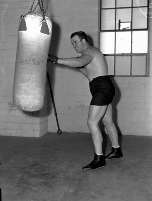 Amateur boxers from all around the area are preparing for the 1942 Golden Gloves District Tournament in Fort Worth, Texas. One of the top contenders in the heavyweight division is Jack Russell. He was an all-conference end at Baylor University and has been working out with other members of the Texas Steel Company team. He is shown training on a Gold Smith punching bag, wearing gloves and shorts.