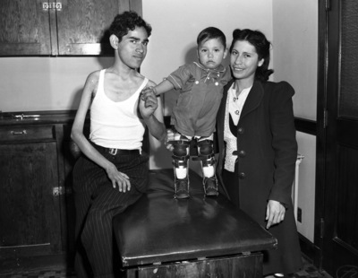 People with infantile paralysis, Ernest Garcia, Richard Alvarado, age 2, and Mrs. Treno Alvarado; proceeds from the President's Birthday Balls will be used to fight the paralysis, 01/27/1942
