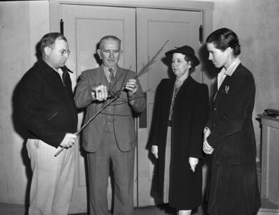 W. A. Smith, (left) Miss Gayle Roberts, assistant home demonstration agent (right), and Mrs. J. Bob White, president of Birdville Home Demonstration Club, watching L. Q. Roby give a demonstration of tree pruning at Birdville School. The gathering was one of a series sponsored by County Agent Counts to encourage cultivation of orchards and gardens. Published in the Fort Worth Star-Telegram morning edition, January 28, 1942.