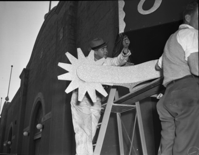 Southwestern Exposition and Fat Stock Show worker Pernie Yarnell, is shown standing on a latter installing the emblem for the Exposition's night club, the Silver Spur. He is wearing a hat and a uniform covered in dirt.