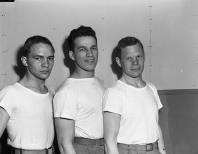 Boxers in the Fort Worth, Texas, area are preparing for the 1943 Golden Gloves District Tournament. The competition will be held at Will Rogers Memorial Coliseum. Three Marines competing in the tournament, left to right, are Private William J. Rushka (lightweight), Private Andrew Olenick (middleweight), and Corporal Ray Benson (welterweight). They are lined up against a wall, wearing t-shirts and trousers.