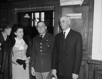 Movie star Judy Garland is in Mineral Wells, Texas to visit Camp Wolters and appear in a U. S. O. Show. The famous Wizard of Oz actress is posing for a picture with Brigadier General Emil F. Reinhart, center, and Mayor J. C. Miller. Miss Garland led a parade of 2,000 school children to the post office to purchase defense stamps. She is wearing a bow in her hair, a suit with lace around the collar, and a fur jacket over her shoulders. General Reinhart is the commander of Camp Wolters. He is dressed in his military uniform. Mr. Miller is the Mayor of Mineral Wells, Texas. He is dressed in a double breasted suit and holding his hat. The men were the reception committee and received the children purchasing defense stamps are the post office. Published in the Fort Worth Star-Telegram morning edition, January 31, 1942.