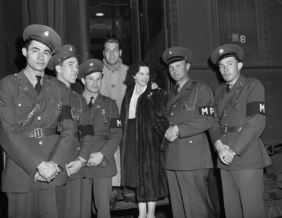 Judy Garland and her husband, David Rose are visiting Fort Worth, Texas. Miss Garland is set to perform in a United Service Organizations (U. S. O.) show for the soldiers at Camp Wolters in Mineral Wells, Texas. The couple is shown arriving at the Texas and Pacific Railway Station with an escort of Fort Worth Military Police. Ms. Garland is the first honorary woman member of the military police of World War II. The officers are left to right Private L. M. Howell, Corporal L. A. Owen, Private Jack Betz, Private N. O. Shepherd, and Private Robert Cooper. The officers are dressed in their military uniforms. Mr. Rose, a composer and director, is wearing a buttoned winter coat. Miss Garland, famous for her role in the Wizard of Oz, is wearing a button-up blouse, skirt, a fur coat, and a brooch. Published in the Fort Worth Star-Telegram evening edition, January 30, 1942.