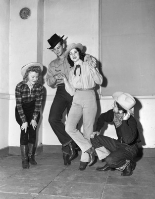 These 'Put Your Little Foot' dancers will participate in Texas Christian University's Ranch Week observance Friday and Saturday, January 30-31. Left to right are Miss Nelleen Paul, Panhandle senior; Clifton Caffey, Colorado City, Texas freshman; Miss Jean Morrison, Colorado City, Texas sophomore, and David Smith, Fort Worth, Texas sophomore. Clifton and Jean are in a dance pose while Nelleen and David are looking on in support. All four of them are wearing fashionable Western style clothes with cowboy hats and cowboy boots. Published in the Fort Worth Star-Telegram evening, February 4, 1942.