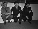 Southwestern Exposition and Fat Stock Show officials (left to right) Verne Elliott, rodeo manager, John B. Davis, general manager of the show, and Ed McCarty, arena director. All three men are seen wearing suits and a hat as they squat down and lean against the wall of a shed.