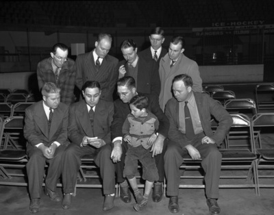 The Matchmaker's staff is preparing for the 1942 Golden Gloves District Tournament at Will Rogers Memorial Coliseum in Fort Worth, Texas. They are charged with handling contestants during the boxing tournament. Left to right, on the front row, are Vincent Duross, Woodie Taylor, A. E. Johnson with his son, and F. D. Smith. On the back row are Arthur Huff, T. M. Hood, Bryan Gaut, Douglas Whittington, and Howard Crane. A sign in the background is advertising an ice hockey game between the Fort Worth Rangers and St. Louis. The entire staff is wearing suits and A. E. Johnson's son is wearing a shirt, jacket and trousers.