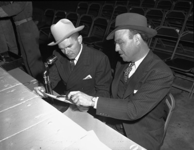 The 1942 Golden Gloves District Tournament is being held at Will Rogers Memorial Coliseum in Fort Worth, Texas. Announcers for the tournament, left to right, are Cy Leland and Buddie Fields. They will keep fans informed on what's what over the public address system. Mr. Leland is calling his sixth Golden Gloves tournament. He is dressed in a cowboy hat and a double breasted pinstripe suit. Mr. Fields is wearing a hat and a three piece pinstripe suit.