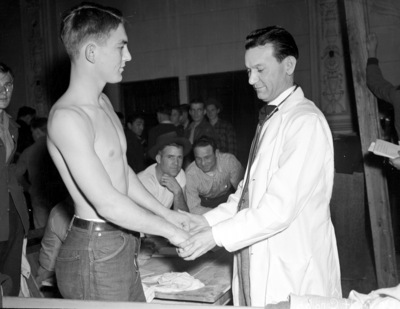 Amateur boxers from all around the area are preparing for the 1942 Golden Gloves District Tournament in Fort Worth, Texas. One of the doctors ensuring the boxers are fit for competition is Dr. M. H. Crabb, right. He is shown examining the knuckles of one of the boxers. Dr. Crabb is dressed in a suit and a lab coat. His stethoscope is draped around his neck. A crowd of people are gathering in the background of the gymnasium.