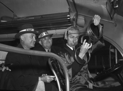 Southwestern Exposition and Fat Stock Show attendees (left to right) W. L. Stewart, potentate of the Moslah Temple Shrine and Champ Clark, Shrine trip chairman and Val Seewald, magician. Val Seewald is performing a magic trick in the passenger seat, as he gazes into some iron rings, while Stewart and Clark look on.