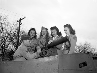 Reserve Officers' Training Corps (R. O. T. C.) sponsors manifested as much curiosity as the cadets at a demonstration of infantry equipment at Jennings Avenue Junior High School by a special unit of the 36th Division. Shown here is a machine gun demonstration by Sergeant (Sergt.) Boyd B. Jackson. It is a heavy machine gun mounted on an armored scout car. Watching the demonstration are the four sponsors, left to right, Junene Doak and Bettye June Thompson, Paschal High School, and Betty Vickers and Sarah Nell Brookshire, Polytechnic High. All are dressed in uniforms. Published in the Fort Worth Star-Telegram morning edition, February 4, 1942.
