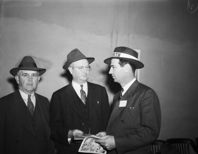 Southwestern Exposition and Fat Stock Show. Law Sone, right, handing leaflets to C. T. Wilkinson, left and W. J. Bryan at Grandview.