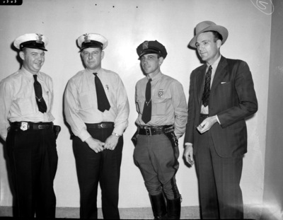 Officer Barnes (second from left) and Warrant Officer Pinkard (far left) aided in the capture of the Norris brothers. Barnes and Pinkard stand with two other unnamed officers in front of an empty wall. Officer Barnes is wearing his parking meter uniform, Officer Pinkard is wearing a striped suit with a brimmed hat and the other two unnamed officers are wearing police uniforms. T. N. Norris who was on the FBI's most wanted list, was captured about 12 miles southeast of Kennedale, after a chase by city detectives, FBI agents and Texas Ranger. The No. 1 'badman' was given 436 years for robbery and murder in Fort Bend, Richmond and Houston in 1936. Norris' brother, Gene Paul Norris, 21, and his girlfriend, Jeanette Lyle were captured with him. Published in the Fort Worth Star-Telegram evening edition, February 24, 1943.