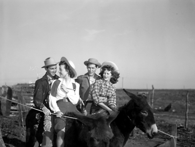 With plans to enter a donkey race Saturday afternoon, one of the highlights of Texas Christian University's fourth annual Ranch Week, these four students tuned up their mounts in trial spins Thursday afternoon. Left to right, Vance Gorman, Big Sandy, Texas; Miss Tomasine Stanley, San Angelo, Texas; Bill Boren, Memphis, Texas; and Miss Betty Beckham, Plano, Texas; Mr. Boren is directing Ranch Week.