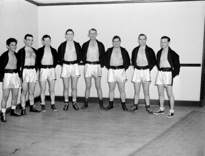 The 1942 Golden Gloves District Tournament was held at Will Rogers Memorial Coliseum in Fort Worth, Texas. The winners of the eight weight classes are shown standing in a line against the wall. They are, left to right, Jose Andreas (flyweight), Donald Nasche (lightweight), Jack Osteen (featherweight), Buster Burrell (middleweight), Pee Wee Holton (heavyweight), Bill Anderson (light-heavyweight), Sam Bates (welterweight), and Raymond Kane (bantamweight). These boxers will move on to represent the district in the State Tournament. They are all wearing boxing trunks with "Ft. Worth" printed on them, and jackets.