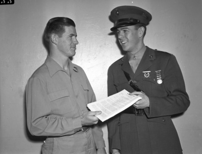 Lieutenant Cleland E. Early is a Texas Christian University graduate and a Marine recruiter. This twenty-two year old West Texan from Stinnett attended a six-month officers' training school in Quantico, Virginia with 359 other young men. Lieutenant Early is returning to TCU to recruit other students into the program. Kyle Gillespie, left, is handing an application to Lieutenant Early for a commission in the United States Marine Reserves. Gillespie is the star quarterback on the Texas Christian University football team. He is wearing a button-up shirt and trousers. Published in the Fort Worth Star-Telegram morning edition, February 8, 1942.