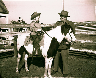 Sid Richardson with great nephew Edward Perry Bass on a horse at Sid's Dutch Branch Ranch, Benbrook; Nancy Lee Bass standing behind the fence in background, 1947