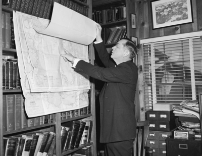 Image shows Reverend J. N. R. Score is the new president of Southwestern University in Georgetown, Texas. He is shown looking upon a map in front of a book shelf. He is wearing a suit and eyeglasses . In background framed pictures are shown hanged on wall. Published in the Fort Worth Star-Telegram morning edition February 12, 1942.