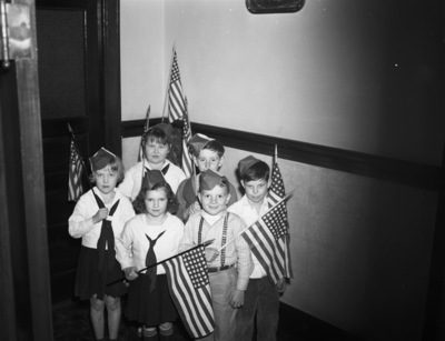 Mount Carmel Academy Red Cross benefit program. participants were (front row, left to right) Edith Anne Johnston, Mary Deeveen Carney, Donald May, Robert Sayers., (back row, left to right) Carolyn Ann Runyon and John Cordova. The students are holding United States flags. The girls are wearing their school uniforms of a dark skirt, white long sleeve blouse and loose-fitting tie. The boys are dressed in slacks and shirts of various kinds. The children are also wearing hats that likely are red, white and blue.