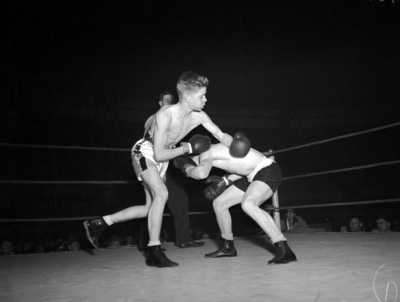 The 1942 Golden Gloves State Tournament is being held at Will Rogers Memorial Coliseum in Fort Worth, Texas. Fighting, left to right, in the bantamweight division are Hubert Gray and Junior Jones. Gray is a representative of Wichita Falls, Texas. He is shown swinging a hard left at his opponent. Jones, of Olney, Texas, is ducking below the blow. The referee is standing in the background. Gray went on to win the fight by outpointing Jones.