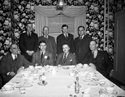 The 1942 Golden Gloves State Tournament is being held at Will Rogers Memorial Coliseum in Fort Worth, Texas. The judges and referees for the tournament are shown enjoying a dinner. On the front row, left to right, are K. N. Clapp, T. W. Waggoner, Dr. Eugene Brown, and Sully Montgomery. On the back row, standing, are Milton Coffey, W. R. Watt, Marshall Brown, and Ray Crowell. Mr. Clapp is a judge from Lubbock, Texas. He is dressed in a three piece suit. Mr. Waggoner, of LeFors, Texas, is a referee. He is wearing a suit with a handkerchief in the pocket. Dr. Brown, of Fort Worth, Texas, is chairman of the judges' committee. He is dressed in a double breasted suit. Mr. Montgomery, of Fort Worth, Texas, is chief of the referee staff. He is wearing a three-piece suit. Mr. Coffey of Fort Worth, Texas, is a referee. He is dressed in a double breasted pinstripe suit. Mr. Watt is a Fort Worth, Texas, judge. He is dressed in a three-piece suit. Mr. Brown of Dallas, Texas, is a judge. He is wearing a three-piece suit. Mr. Crowell is judge from Abilene, Texas. He is dressed in a pinstripe, three-piece suit. The program is arranged so that no judge or referee is active when a boxer from his district is in the ring.