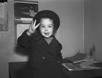 Marguerite Jane Pattillo is the three year old daughter of Mr. and Mrs. A. L. Pattillo. Marguerite Jane is celebrating her birthday on Valentines Day. She is sitting on a desk and holding up three fingers to demonstrate her age. She is wearing a hat, and a winter coat. There is a calendar hanging on the back wall. Published in the Fort Worth Star-Telegram morning edition, February 14, 1942.