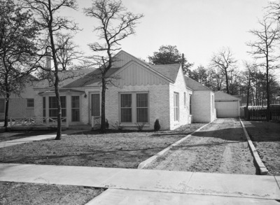 The new home of G. E. Paules Junior is at 1208 Bonnie Brae Boulevard, Fort Worth, Texas. The brick house has a bay window and a driveway on the right that leads to a detached two-car garage at the back. The property has mature trees. Published in the Fort Worth Star-Telegram morning edition, February 15, 1942.