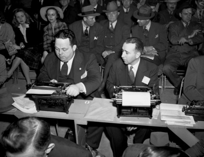 The 1942 Golden Gloves State Tournament is being held at Will Rogers Memorial Coliseum in Fort Worth, Texas. Sports writers from every part of Texas are gathering for the annual tournament. Many of them help sponsor teams in their home districts and arrange for their champions to make the trip to Fort Worth, Texas. Sitting at a ringside table, behind a typewriter is Collier Parris (right). He is a writer with the Lubbock Avalanche Journal. He is dressed in a three-piece suit. There are crowd of people in the background, sitting in the stands.