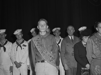 At the annual meeting of the Fort Worth Council, Boy Scouts of America, at Will Rogers Auditorium, Jack Lark, of Denton, Texas, was presented with the Silver Beaver award. He is wearing his scout uniform and a sash that displays all the badges he has earned. Others at the meeting are standing behind him.