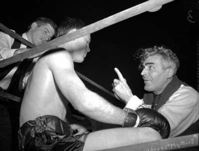 The 1942 Golden Gloves State Tournament is being held at Will Rogers Memorial Coliseum in Fort Worth, Texas. During the timeout between rounds, Scotty McLaughlin (right) is talking to welterweight boxer Marvin Bryant in a corner of the ring. McLaughlin is wearing a tie and a jacket and holding a sponge. The referee is leaning over the side of the ropes. Bryant went on to win the welterweight title.