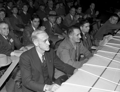 The 1942 Golden Gloves State Tournament is being held at Will Rogers Memorial Coliseum in Fort Worth, Texas. Johnny Bevel is the Golden Gloves timekeeper. He is shown watching the fights from his ringside seat at the left. He is dressed in a three-piece pinstripe suit. A crowd of people are watching in the background.
