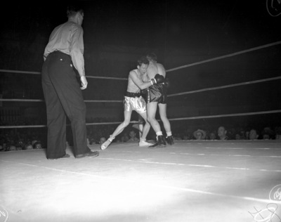 The 1942 Golden Gloves State Tournament is being held at Will Rogers Memorial Coliseum in Fort Worth, Texas. Competing in the semifinals of the welterweight division are Jack Osteen (facing camera) and Arlo Roye. Osteen, of Fort Worth, Texas, is firmly clasping his opponent in the second round. Roye, a representative of San Angelo, Texas, is attempting to break free. Roye went on to beat Osteen and later won the welterweight title. The referee is shown watching the action in the foreground.