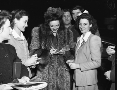 Darnell, Linda; Celebrities; Autographing; Fans (Persons); Coats; Dresses; Fur garments