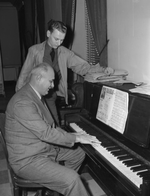 Private Harold Bentley (standing), of Camp Wolters, listening to Ed J. Keyes, of Oklahoma City, Oklahoma, regional director of the United Service Organization (U. S. O.), play the piano before Keyes addressed a meeting of U. S. O. officials. Private Bentley is wearing his military uniform and a coat. Keyes is wearing a suit and is sitting at the piano. There is sheet music propped up on the piano.