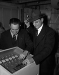 The Southwestern Exposition and Track Meet kicked off Friday in Fort Worth, Texas. For the first time, runners will be mechanically timed. Shown with part of the delicate mechanism is its inventors G. L. Ledingham, left, and E. P. Haltom. They call the device a "Trackometer". Mr. Ledingham is wearing a three piece suit. Mr. Haltom is dressed in a hat and a three piece suit. He is holding a starting pistol in his right hand.