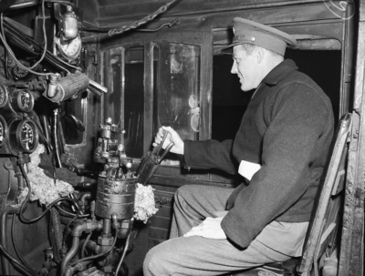 The winners of the Golden Gloves State Tournament in Fort Worth, Texas, are traveling by train to Chicago, Illinois, to compete in Nationals. Corporal J. Olcott Phillips, the state heavyweight champion, is getting a chance to "drive" the engine as the team rolls to Chicago, Illinois. Phillips is a native of Fort Worth, Texas, and a member of the 36th Division of the United States Army. He is dressed is a peaked cap, coat, and trousers.