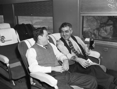 The winners of the Golden Gloves State Tournament in Fort Worth, Texas, are traveling to Chicago, Illinois, to compete in Nationals. Riding in the passenger car of the Chicago, Illinois, bound train, left to right, are Marvin Bryant and Coach Scotty McLaughlin. Bryant is a welterweight champion from Dallas, Texas. He is one of the most promising Texas contenders, a two-handed puncher with speed and kick. He is dressed in a button-up shirt, necktie, sweater vest, and trousers. Coach McLaughlin is Bryant's instructor. He is drinking a bottle of soda, dressed in a button-up shirt, necktie, vest, and trousers.