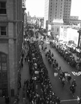 Southwestern Exposition and Fat Stock Show opening parade. Cowgirls, cowboys, bands playing, horses, and flags, all seen and heard at the Stock Show parade Friday afternoon. Thousands lined Main and Houston streets for the parade, first feature of the 10-day show.